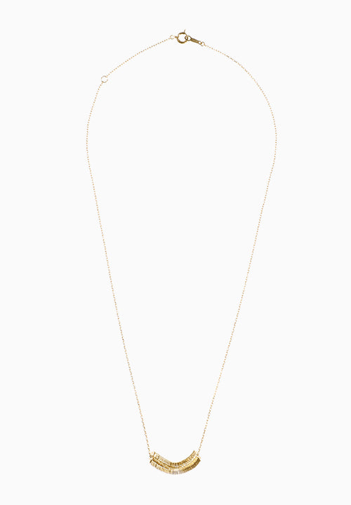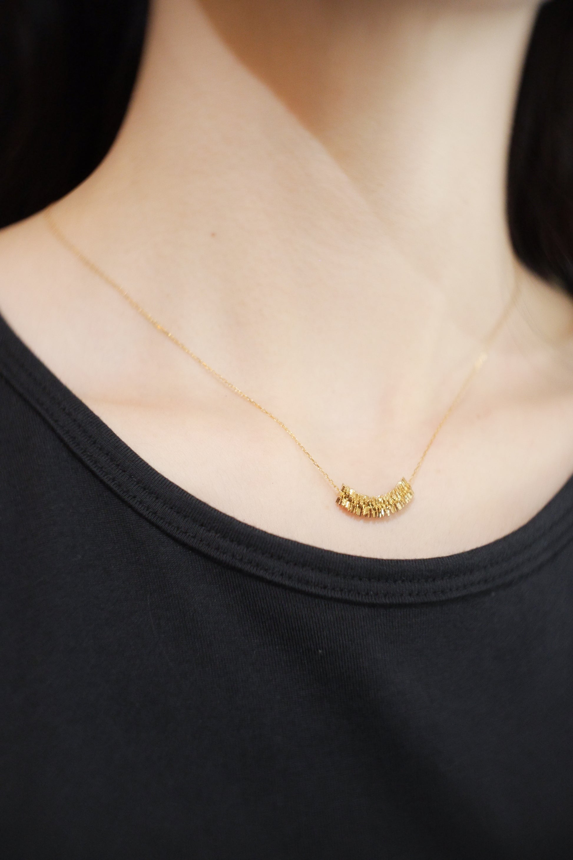 Stella est un collier composé de 60 plaques superposées en forme d'étoile. Vous pouvez voir les silhouettes et les étoiles qui se chevauchent de côté et en diagonale. La différence visuelle vue de face est impressionnante et donne une idée de la beauté de l’art moderne. Les étoiles qui tournent de manière aléatoire le font également scintiller et le font ressembler encore plus à des bijoux.