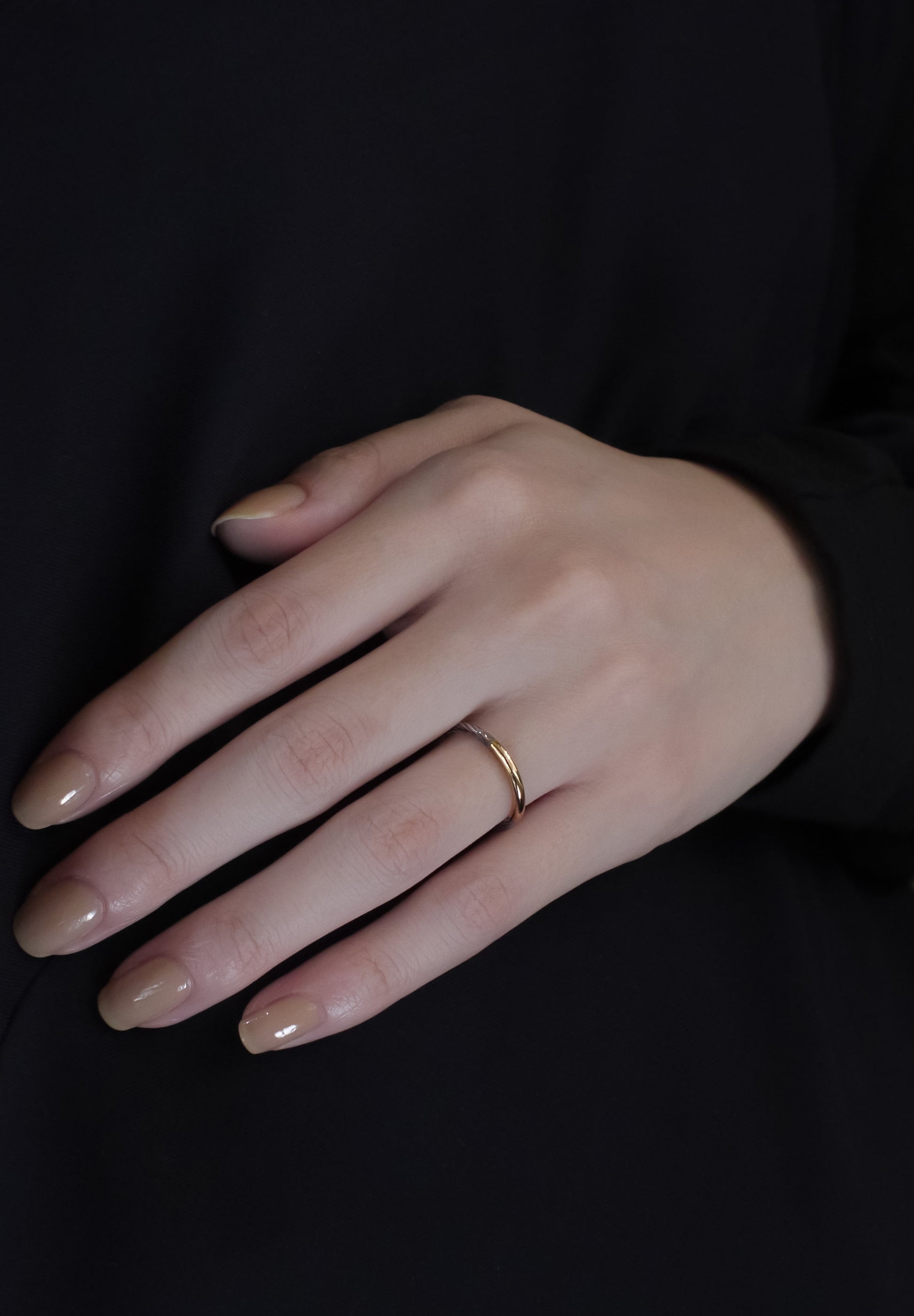 Une bague composée de fil d'argent sterling torsadé et d'un anneau en or jaune 18 carats miroir. Le contraste des matériaux et des détails est impressionnant. Le caractère décoratif des parties torsadées donne une sensation minimale mais solennelle, ainsi que la surface brillante du miroir K18. Une bague inspirée des peintures du peintre Caravage. Cet article est également recommandé pour les alliances et les accords.