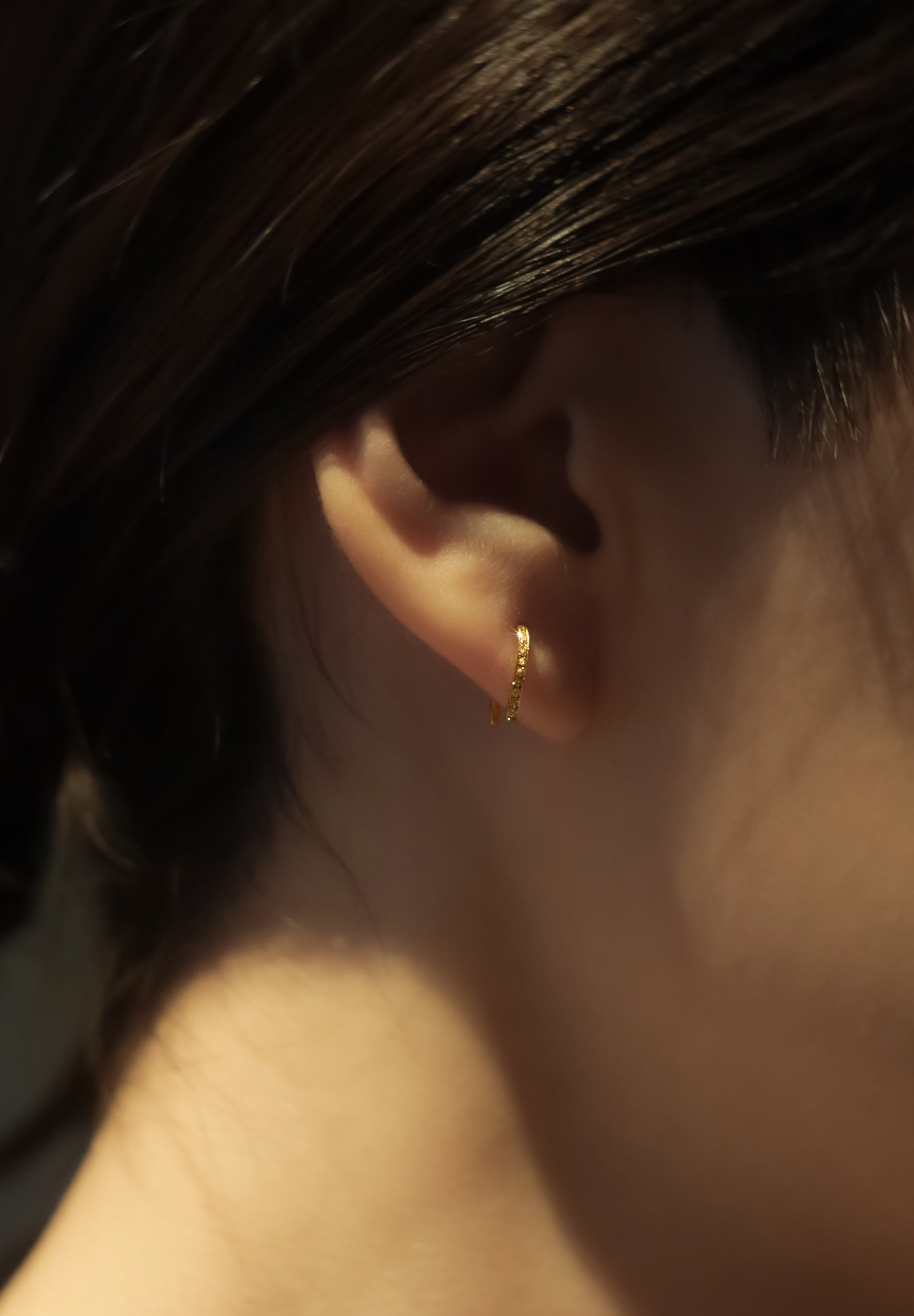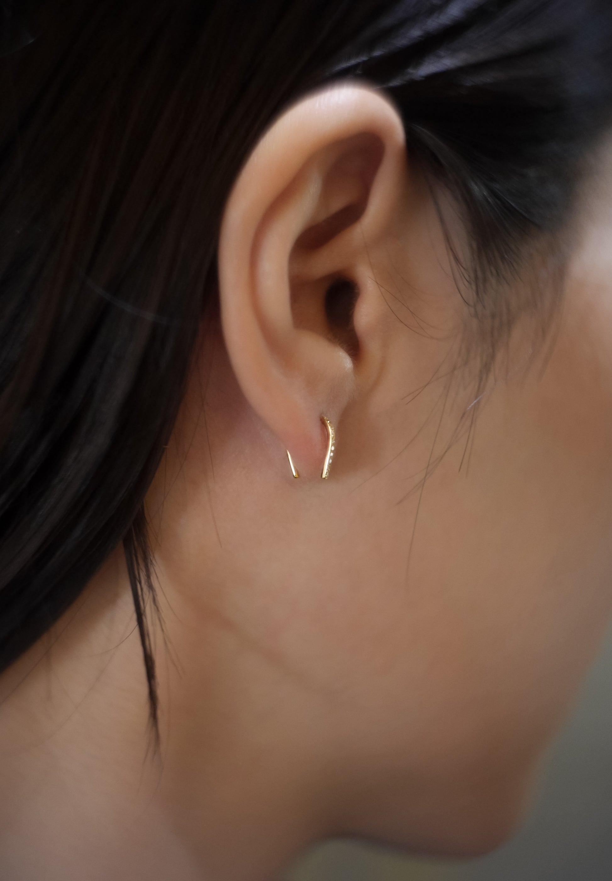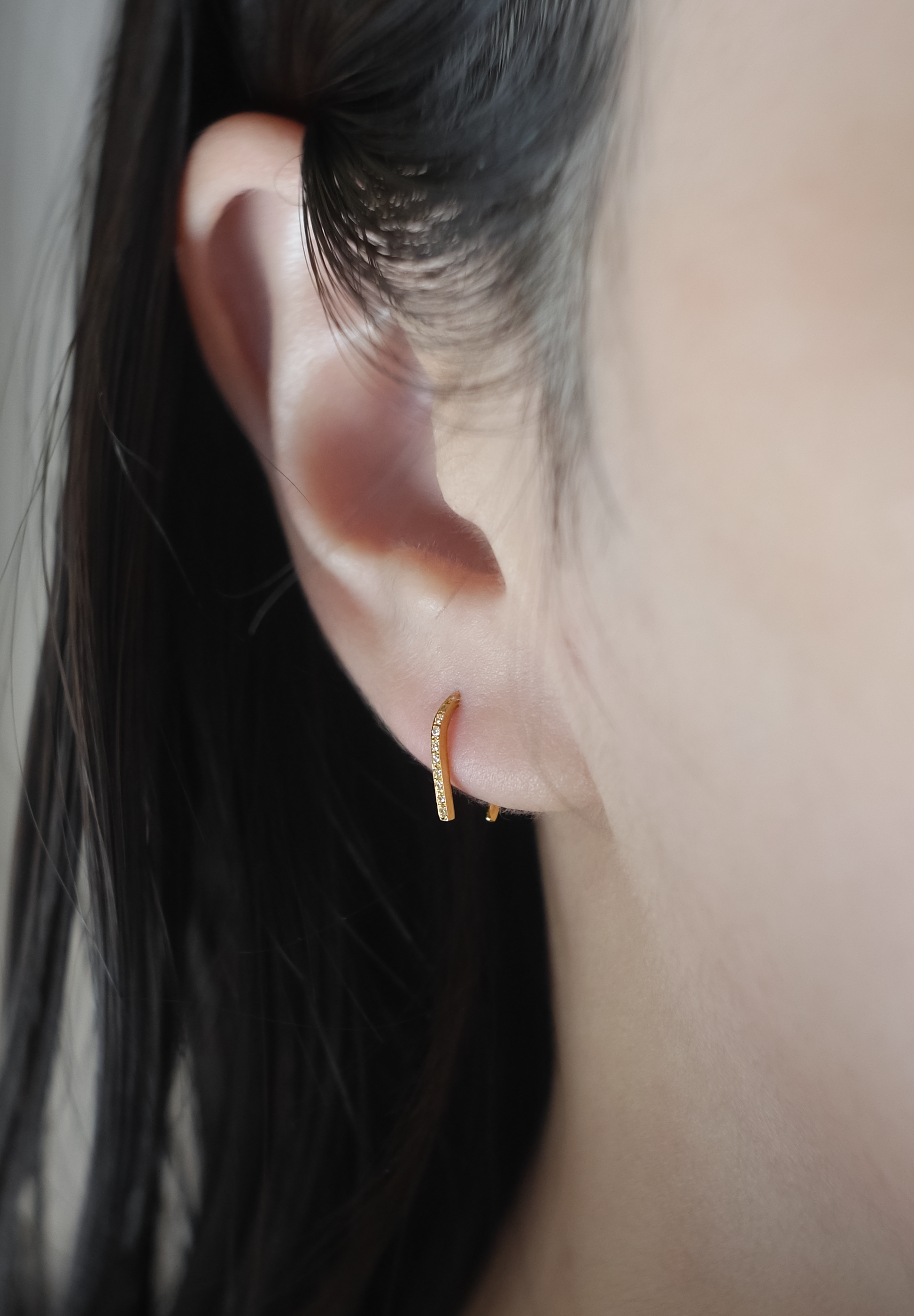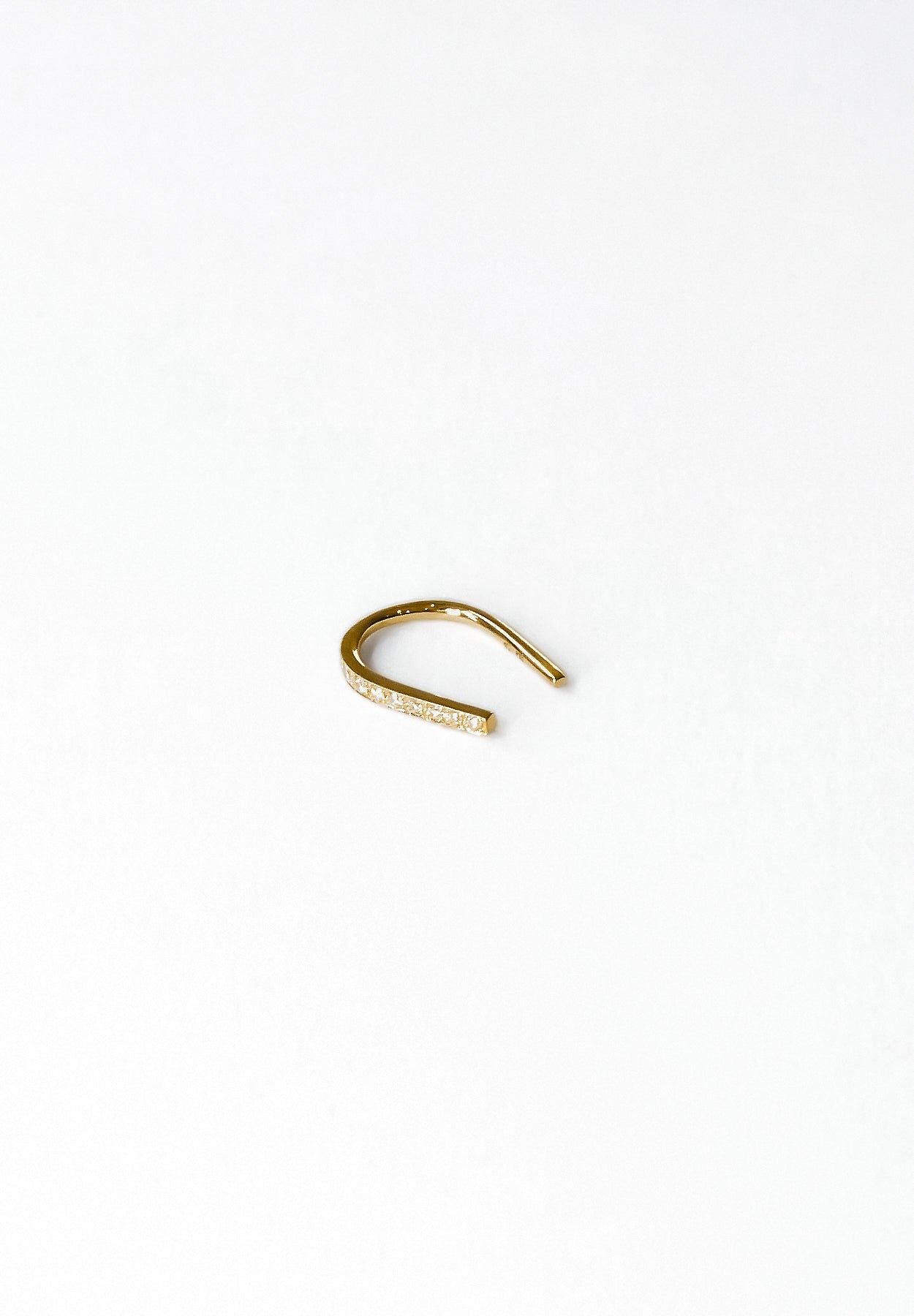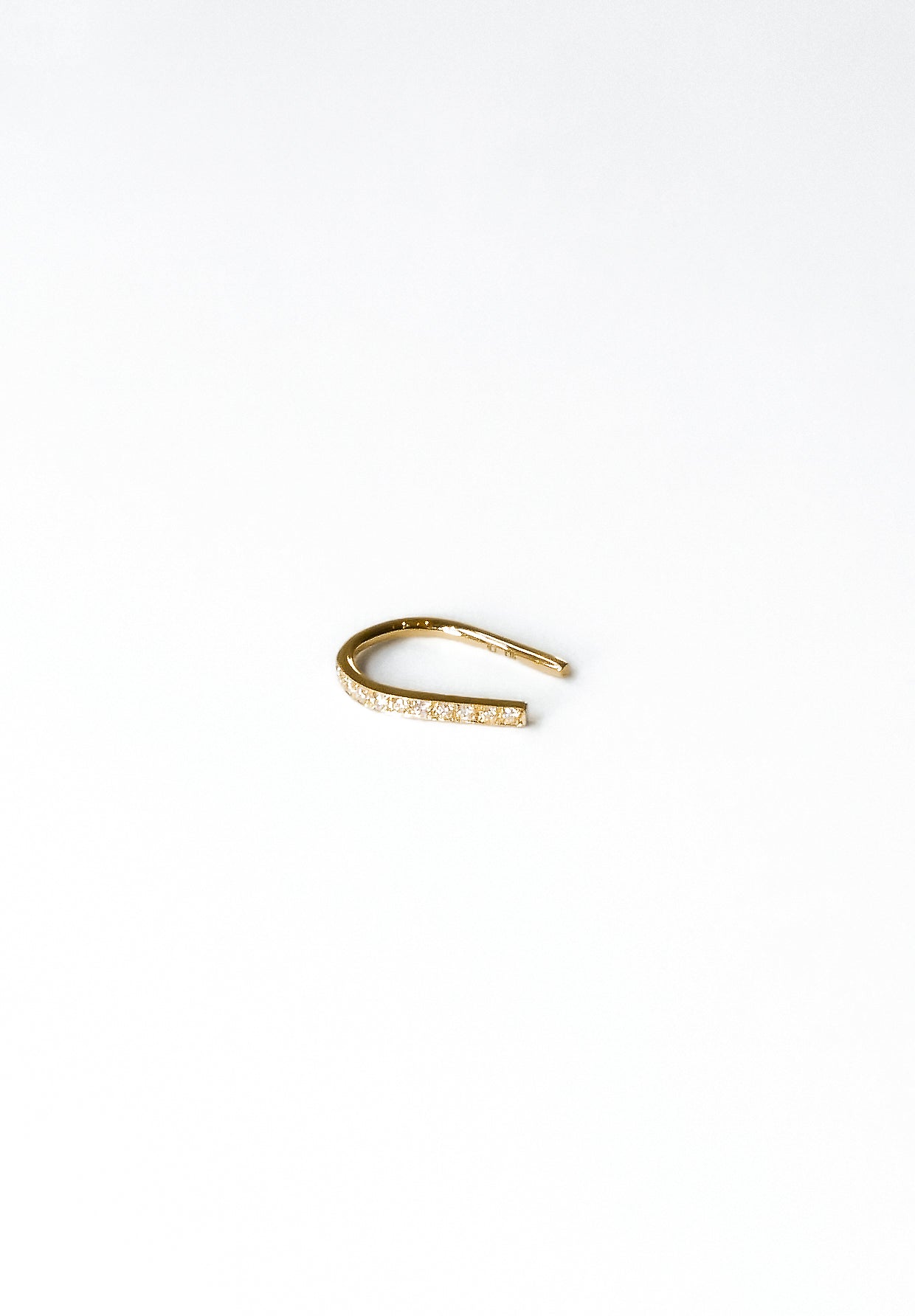 Une version des boucles d'oreilles "Spartacus", conçue avec un motif de sabot de cheval, comporte un petit diamant serti sur le côté qui est tourné vers l'avant lorsqu'on le porte. L'aspect digne du fer à cheval et sa silhouette simple et sophistiquée assurent une tenue suffisante rien qu'en le passant dans le trou de perçage du lobe de l'oreille. Il s'agit de l'élément minimaliste ultime qui peut créer subtilement une atmosphère luxueuse de K18 et de diamants.