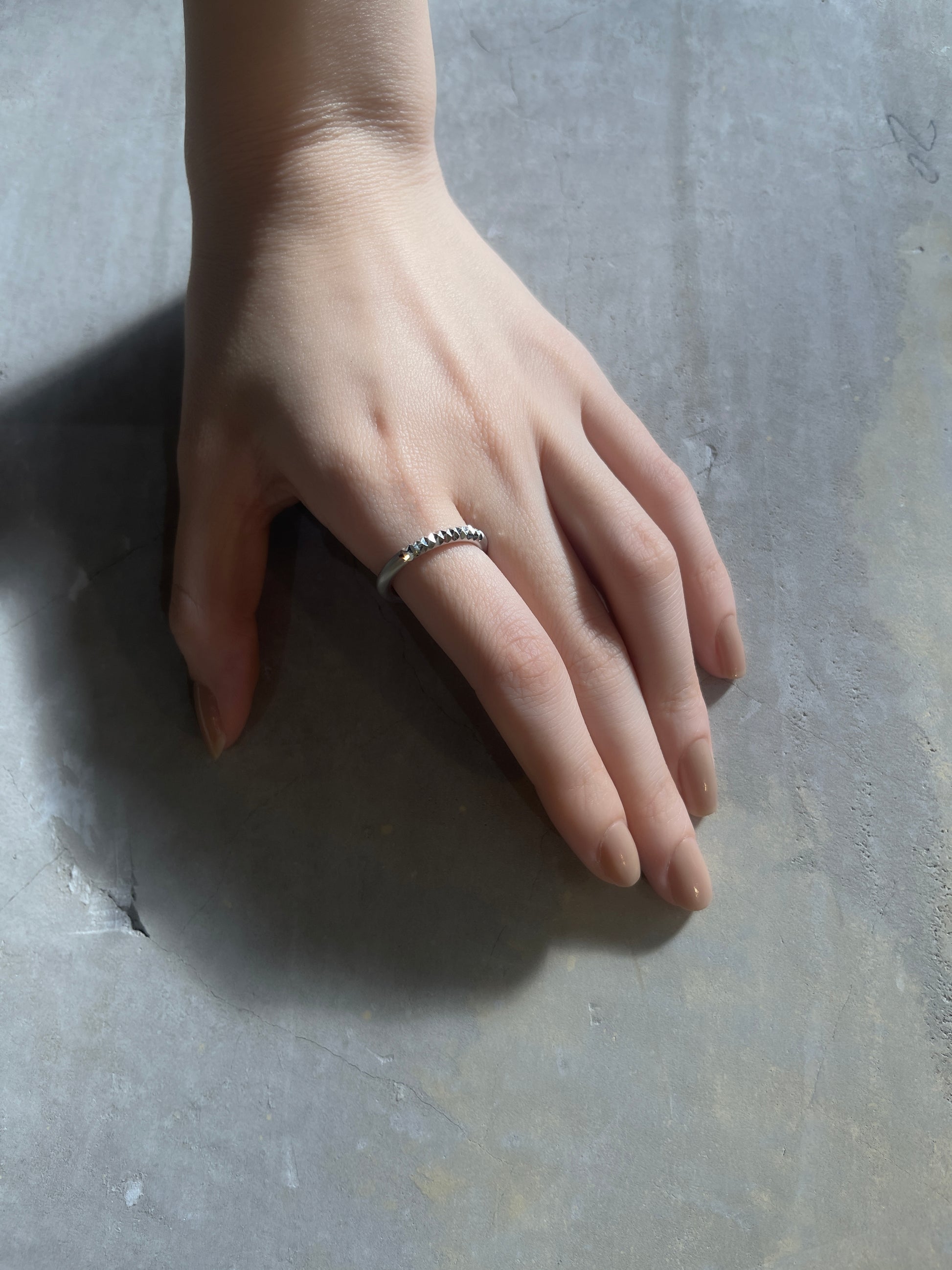 Un quart de section d'un anneau de Φ2,8 mm est sculpté et décoré. La surface ronde et incurvée a une finition mate avec une texture apaisante, tandis que la partie excavée a un éclat rugueux mais éblouissant, créant un beau contraste entre les deux anneaux. Il est sculpté avec une excavatrice spéciale et les zones sculptées sont d'une réflexion éblouissante. Cet article a été inspiré par l’album « Kid A » de Radiohead. *Nous pouvons également réaliser des bagues dans des tailles autres que la taille de doigt indiquée. Veuillez nous contacter. Veuillez nous contacter à .