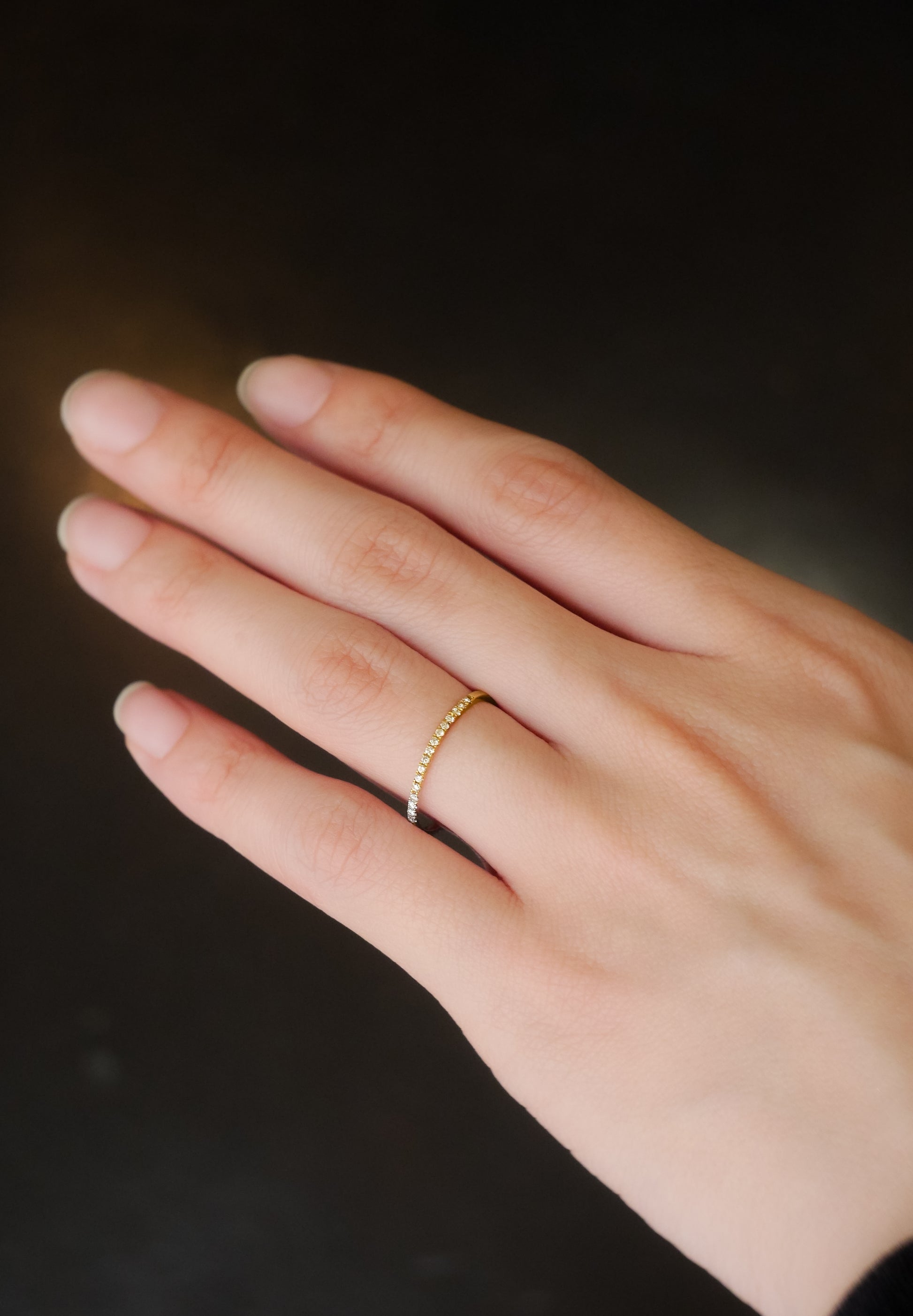 Une moitié de la bague est en platine et l'autre moitié en or jaune 18 carats. Une silhouette carrée composée de lignes carrées. Cette bague est souvent achetée par paire et elle a le sens de partager la moitié les uns avec les autres. De plus, des diamants sont sertis dans la moitié de la bague (demi-circonférence).