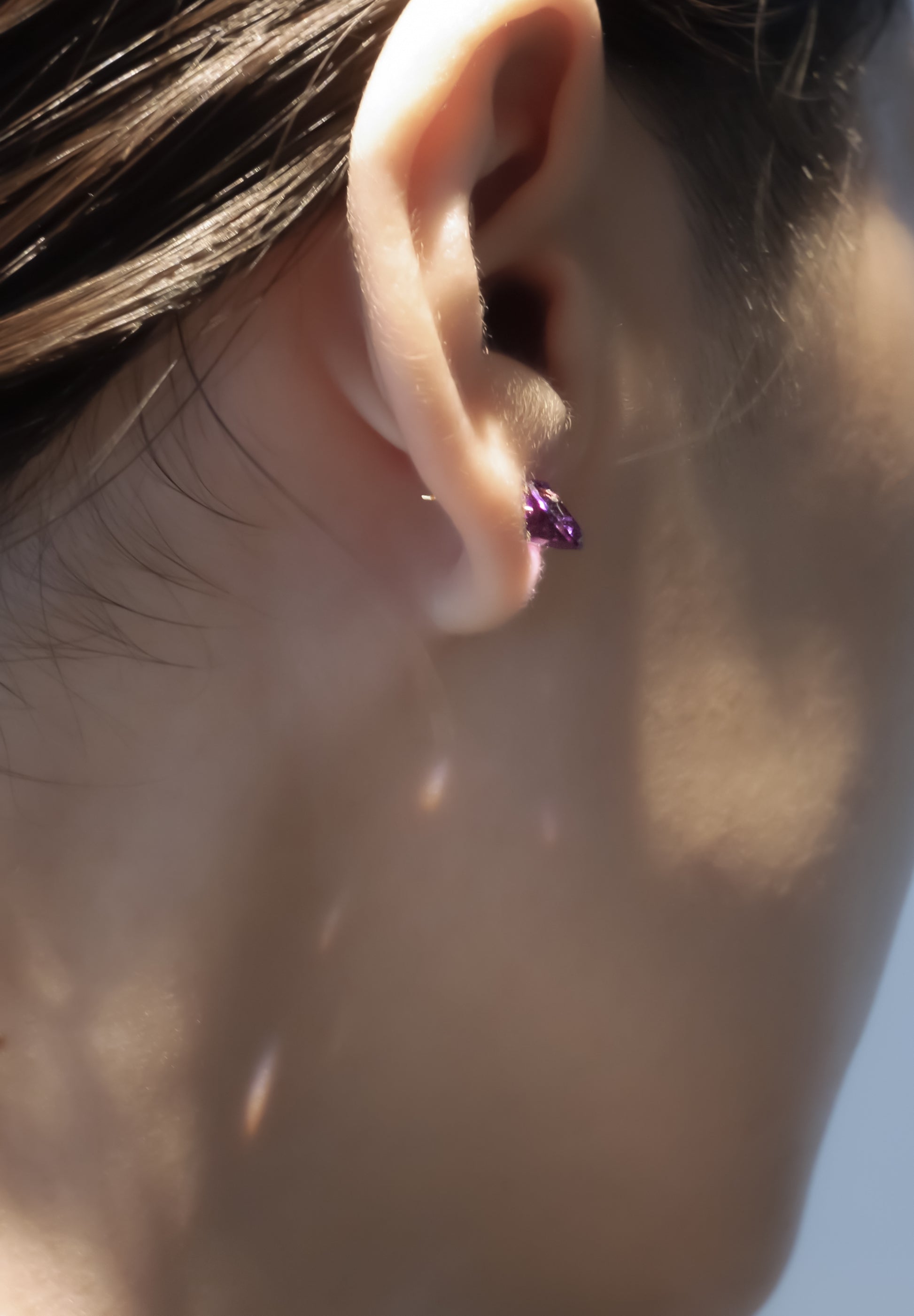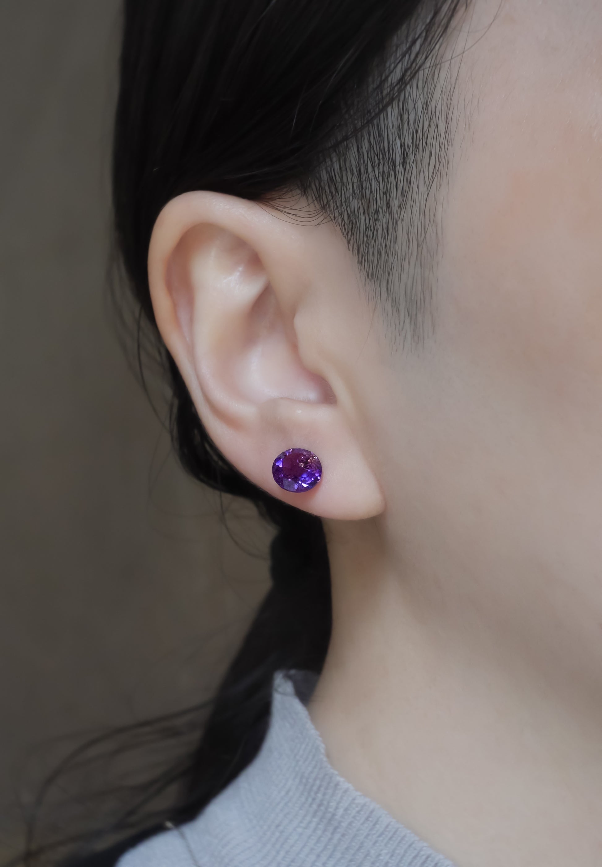 Boucles d'oreilles améthyste taille ronde, OPTICKS. Au lieu d'utiliser une monture en pierre, la pierre de taille ronde est ensuite traitée et conçue de manière à pouvoir être portée à l'oreille. Un design minimaliste qui capture la pureté des pierres semi-précieuses sans aucun gaspillage.