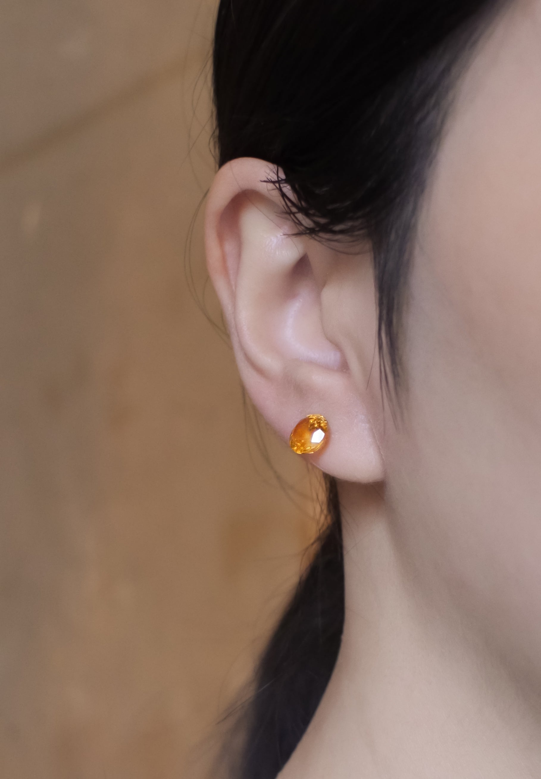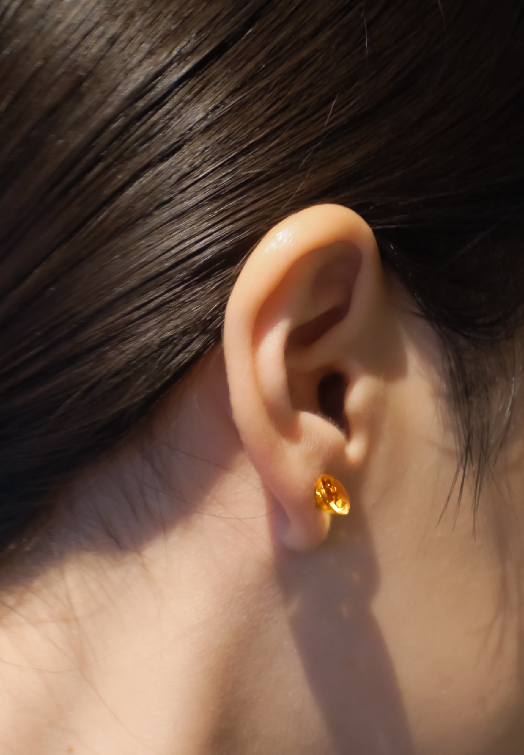 Boucles d'oreilles citrine taille ronde, optique (OPTIQUES). Au lieu d'utiliser une monture en pierre, la pierre de taille ronde est ensuite traitée et conçue de manière à pouvoir être portée à l'oreille. Un design minimaliste qui capture la pureté des pierres semi-précieuses sans aucun gaspillage.